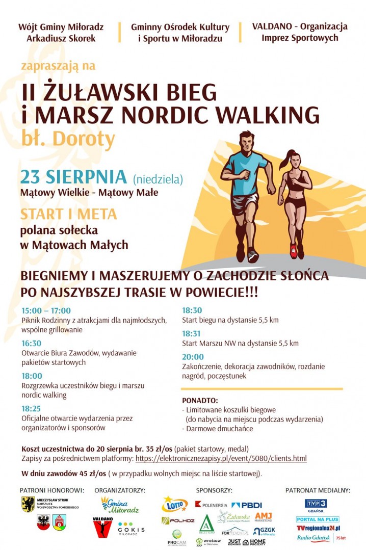 Już w najbliższą niedzielę, 23 sierpnia br. odbędzie się II Żuławski Bieg i Marsz Nordic Walking bł. Doroty. Tym razem gospodarzem przedsięwzięcia będzie sołectwo Mątowy Małe. Zarówno start, jak i meta zlokalizowane zostaną na terenie polany sołeckiej w Mątowach Małych. Zmiana miejsca spowodowana jest wytycznymi sanitarnymi, związanymi z trwającą epidemią. Organizatorzy chcą dołożyć wszelkich starań i stworzyć dla wszystkich komfortowe i bezpieczne warunki, w związku z czym zdecydowali się na umiejscowienie wydarzenia na większej przestrzeni, aby móc zachować odpowiedni dystans społeczny. Organizatorami wydarzenia są Gmina Miłoradz, Gminny Ośrodek Kultury i Sportu w Miłoradzu oraz Organizacja Imprez Sportowych Valdano. Wydarzenie odbędzie się pod patronatem honorowym Marszałka Województwa Pomorskiego - Mieczysława Struka, Starosty Powiatu Malborskiego - Mirosława Czapli oraz Wójta Gminy Miłoradz - Arkadiusza Skorka.