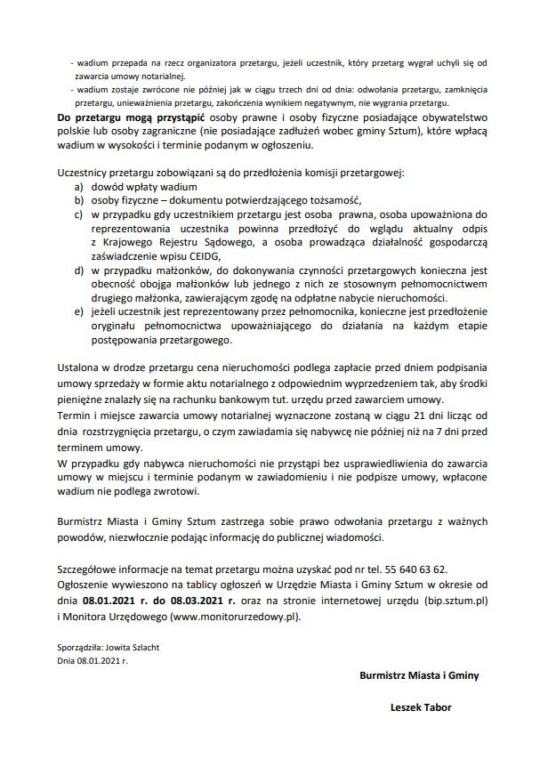 Przetarg odbędzie się 11 marca 2021 r. o godzinie 10 w sali nr 33 Urzędu Miasta i Gminy Sztum.