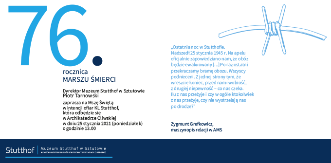 W poniedziałek, 25 stycznia br., uroczystą Mszą Świętą w Archikatedrze Oliwskiej w Gdańsku zostanie upamiętniona 76. rocznica Marszu Śmierci więźniów obozu Stutthof. Coroczne, rocznicowe spotkania byłych więźniów KL Stutthof i ich rodzin z młodzieżą oraz przyjaciółmi Muzeum Stutthof w Sztutowie, odbywały się od 1995 roku. Wtedy to powstała wspólna, z Arcybiskupem ks. Tadeuszem Gocłowskim inicjatywa upamiętniania tych tragicznych wydarzeń. Tradycją było dzielenie się opłatkiem w refektarzu Seminarium Duchownego w Oliwie oraz czas spędzony na wspólnych rozmowach z Ocalałymi. W tym roku, ze względu na sytuację epidemiczną i bezpieczeństwo uczestników, odbędzie się tylko Msza Święta w Archikatedrze Oliwskiej w Gdańsku o godz. 13:00