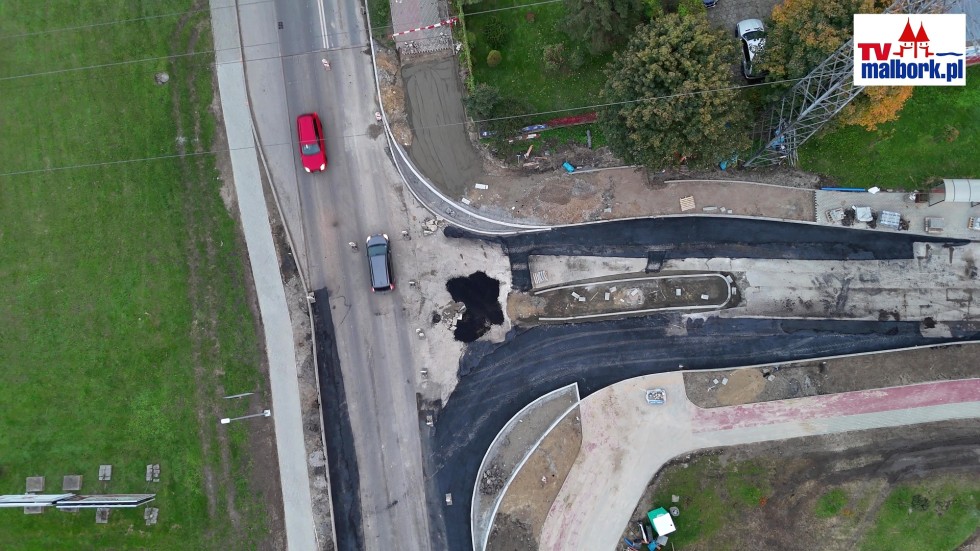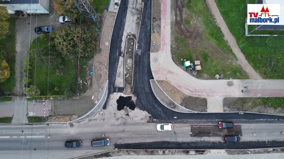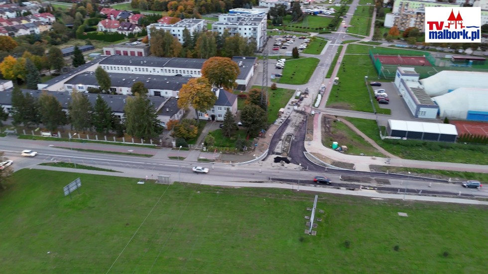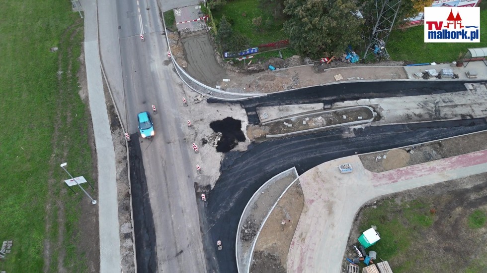 Pierwszy asfalt na przebudowie skrzyżowania DW515 i Kotarbińskiego w Malborku. Zobacz, jak idą prace! Wideo i zdjęcia z drona