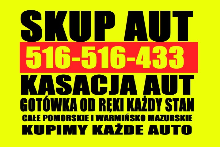 Skup Aut ! Zadzwoń do Nas !!! Skupujemy Auta w Każdym Stanie bardzo dobre drogie,tanie Osobowe,Dostawcze,Vany,Ciężarowe i inne pojazdy Całe Rozbite Skorodowane, Bez Opłat, Z Opłatami, Angliki Każdy Model,Każda Marka Bez Wyjątków! Płacimy Najlepsze Ceny i Zabieramy Auta Od Razu Przedwstępna wycena Przez Telefon! Gotówka Od Ręki! Dojazd Do Klienta Oczywiście Gratis! Dojeżdżamy tego samego dnia Do klienta na terenie woj.pomorskiego Auta Zabieramy Własnym Transportem